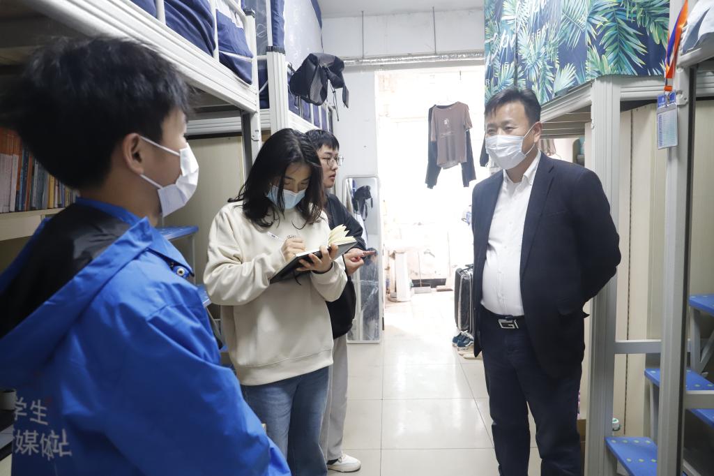 龙吟先后走访两个班级的十余间宿舍,以温和有力的语言、严谨细致的态度对学生们进行疫情防控政策宣讲,并在新11栋210寝室召开了现场师生座谈会。座谈会上,龙吟与同学们亲切交谈,了解他们对学校疫情防控管理期间的想法,关心他们的学习、生活所存在的困难。当学生反映宿舍硬件设施问题时,他现场联系基建后勤处,要求基建后勤处结合学校实际情况帮助同学们解决实际困难、切实改善居住条件。此外,龙吟要求学生提高疫情防控的思想认识,认真组织开展疫情防控专题班会,将防控要求落实到位,并鼓励他们利用周末时间多参加体育锻炼、图书馆阅读、观看电影等活动,在强身健体、心情舒朗的同时,充实生活、陶冶情操。