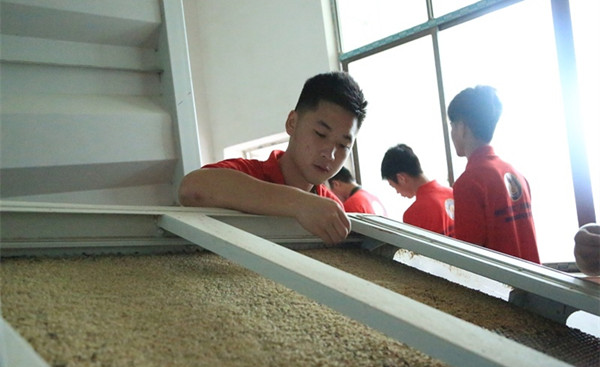(学生仔细观察稻米生产流程。)