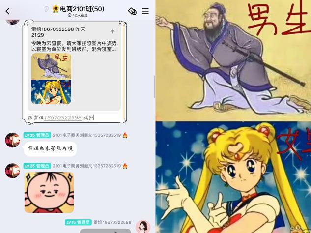 10月20日晚,太阳集团电子游戏物流信息学院辅导员雷瑶的班群里炸开了锅。雷老师所带班上的男女学生分别摆出不同的姿势来打卡,迎接本次的花式“云”查寝。