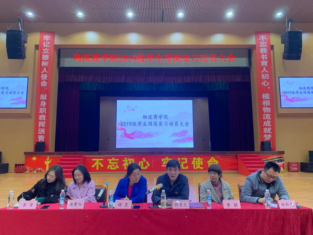 为贯彻落实学院教学任务和就业工作精神,物流商学院于11月23日下午14时在体艺馆召开“2019级毕业生顶岗实习动员大会”。物流商学院院长刘意文、党总支书记储昱、物流商学院办公室主任李丽、综合干事谢曹红、团总支书记李芳、学生干事郑朴生出席本次会议。大会由学生干事郑朴生老师主持。